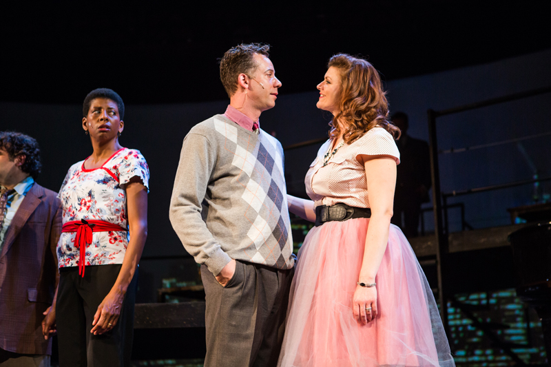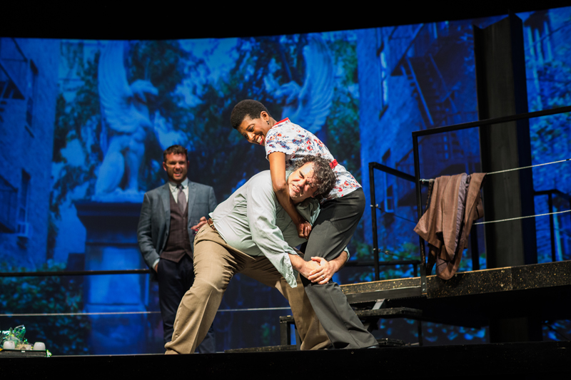 Robert (Keith Pinto*) looks on as Sarah (Velina Brown*) shows off her karate to husband Harry (Christopher Reber*).
