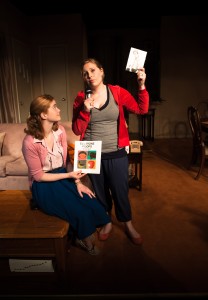 Sherri (Melissa Quine) observes her sister, Grace (Rebecca Schweitzer) as she vents about her ex-boyfriend with the audience.